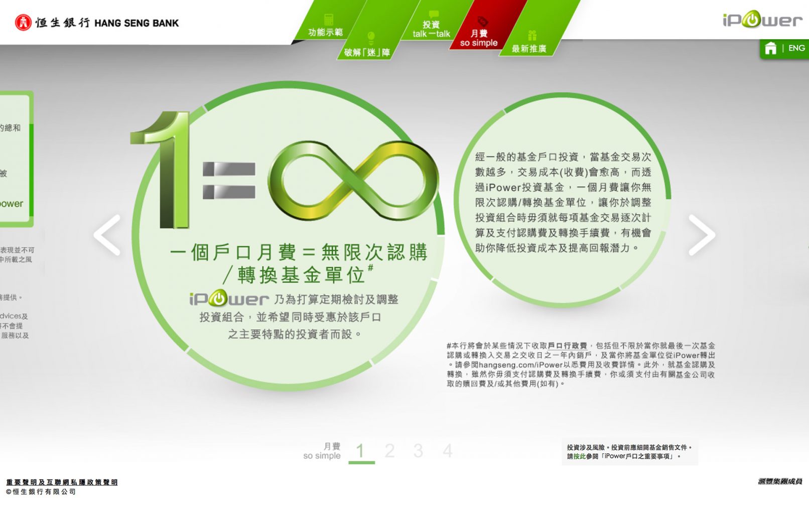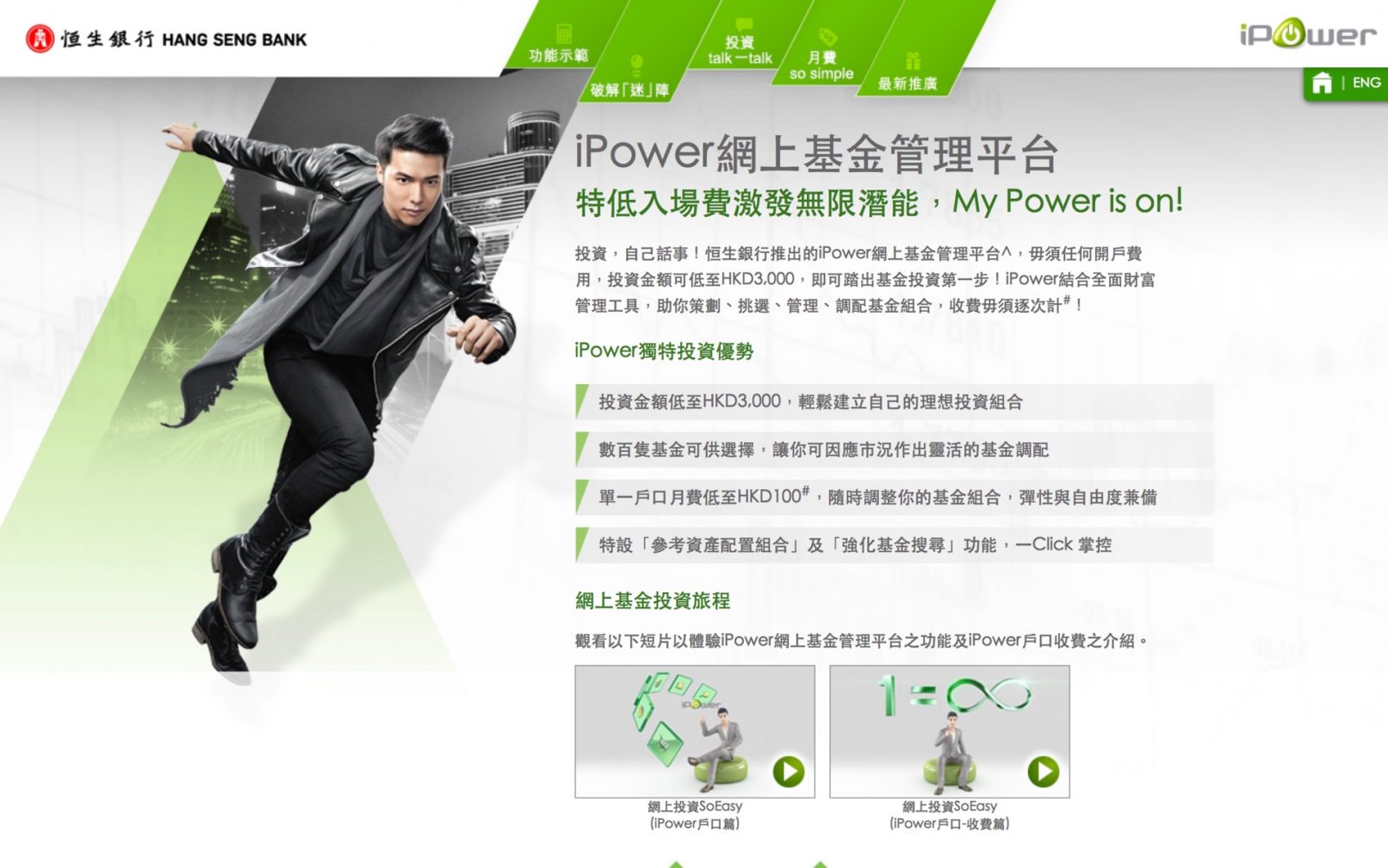 Your investment, your say! Hang Seng – the bank with the highest rated banking services in Hong Kong for 8 consecutive years has broken new ground with its launch of the iPower new generation online investment fund management platform, with a minimum investment amount of HKD3,000 , you can now take the first step in investing in investment funds! iPower provides a comprehensive wealth management tools, facilitates your portfolio planning, selection, management and allocation, without paying fees on a “per-transaction” basis!