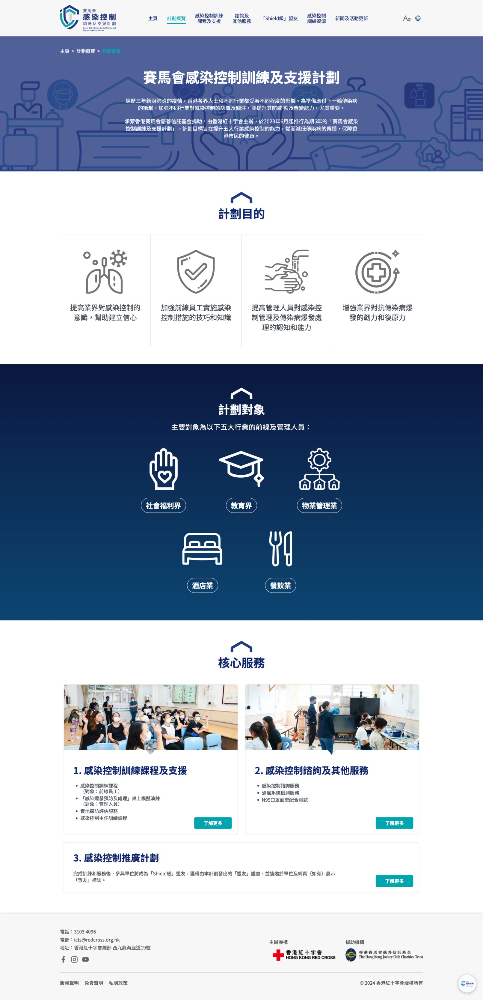The Jockey Club Infection Control Training and Support Project is a five-year initiative aimed at enhancing the infection control capabilities of the five most affected sectors: social services, education, catering, hotel, and property management. The goal of the program is to reduce the spread of infectious diseases and raise public awareness.